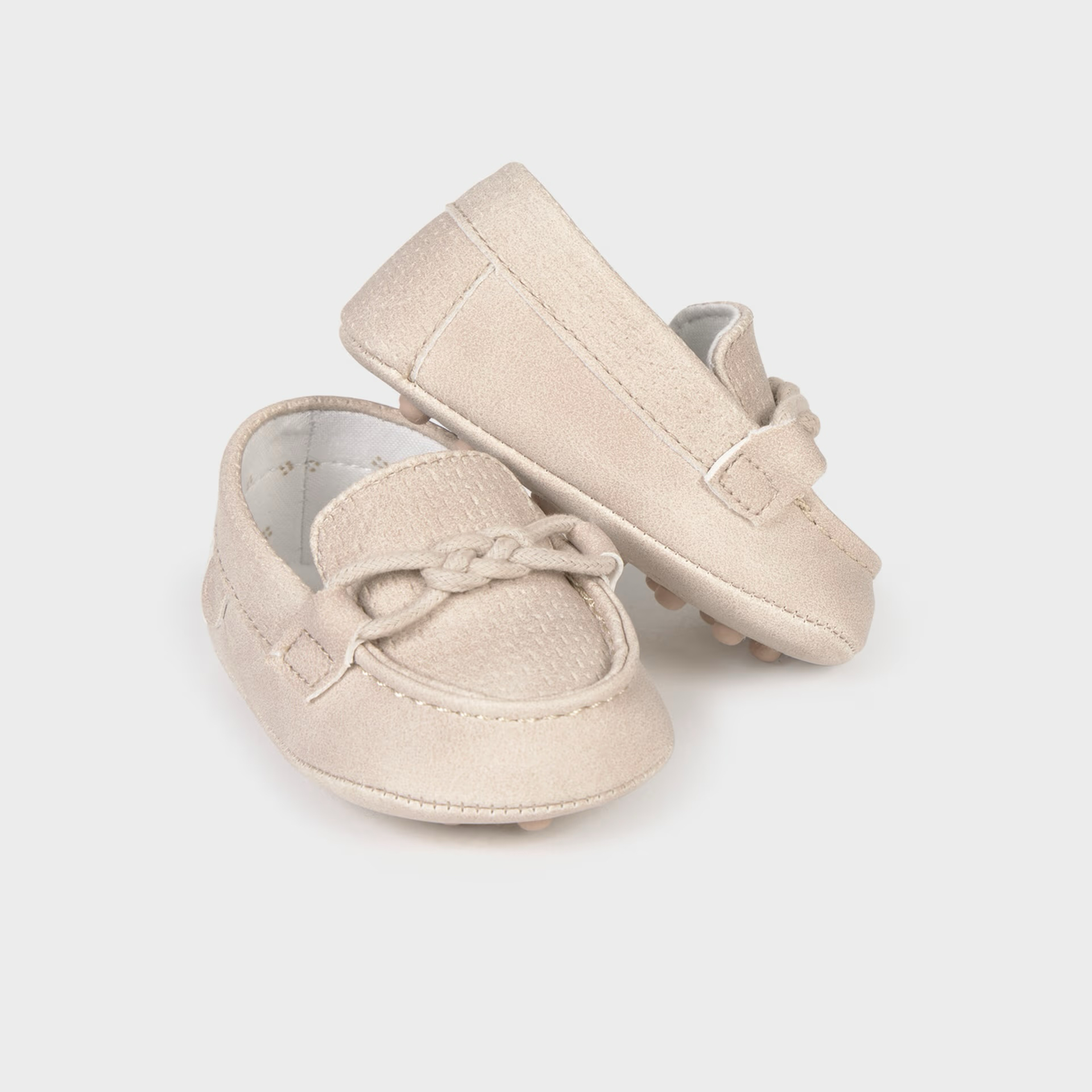 Mokasyny dla noworodka w klasycznym i eleganckim stylu. Ponadczasowe buty, idealne na specjalne okazje. Buty z wyściółką wewnętrzną i podeszwą wewnętrzną z oddychającej bawełny.