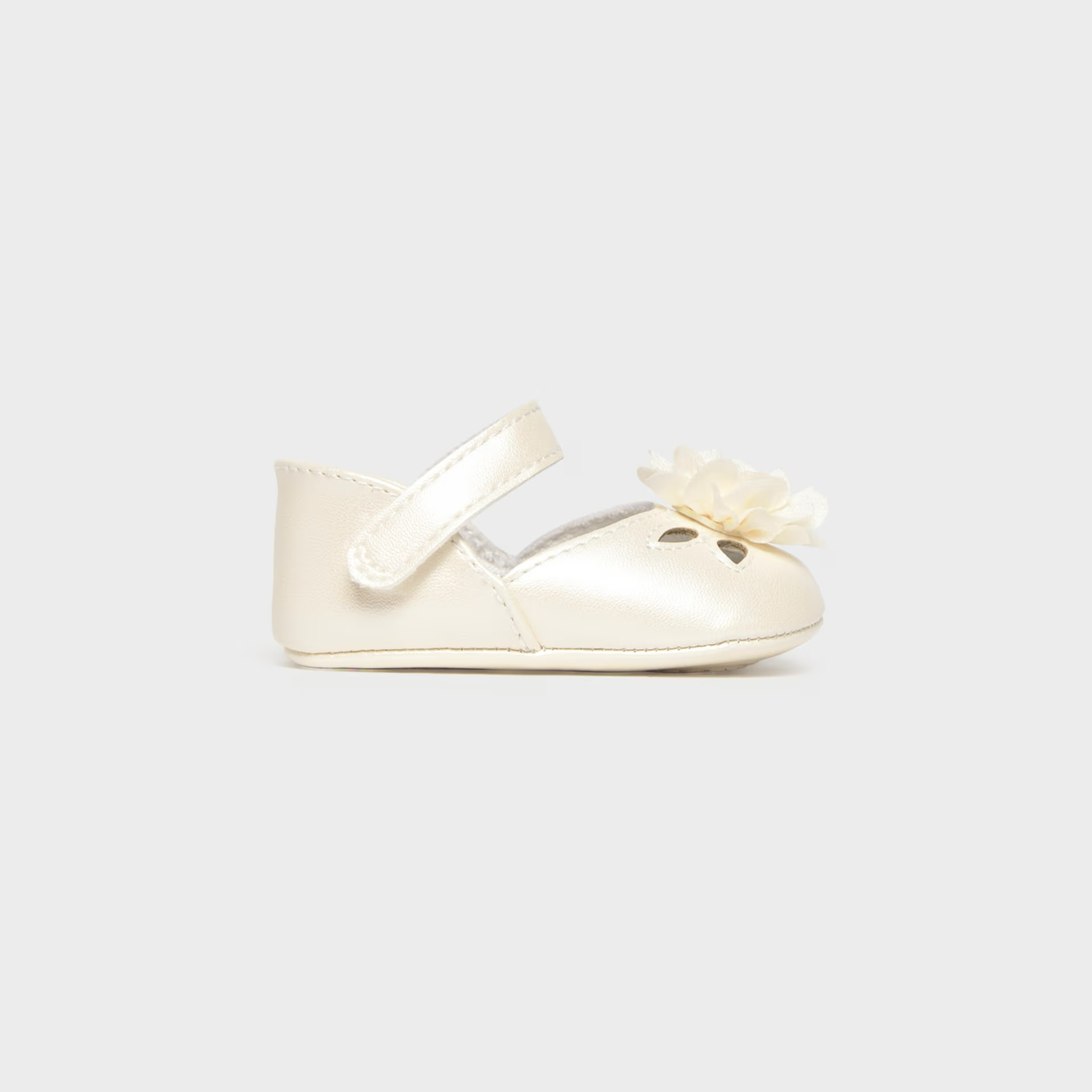 Buty typu balerinki dla noworodka, w klasycznym i ponadczasowym stylu do najbardziej eleganckich stylizacji. Buty z wyściółką wewnętrzną i podeszwą wewnętrzną z oddychającej bawełny. Zapięcie na regulowany rzep.