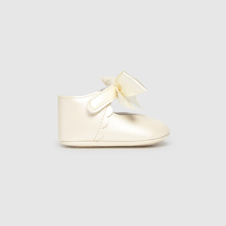 Buty typu balerinki dla noworodka, w klasycznym i ponadczasowym stylu do najbardziej eleganckich stylizacji. Buty z wyściółką wewnętrzną i podeszwą wewnętrzną z oddychającej bawełny. Zapięcie na regulowany rzep.