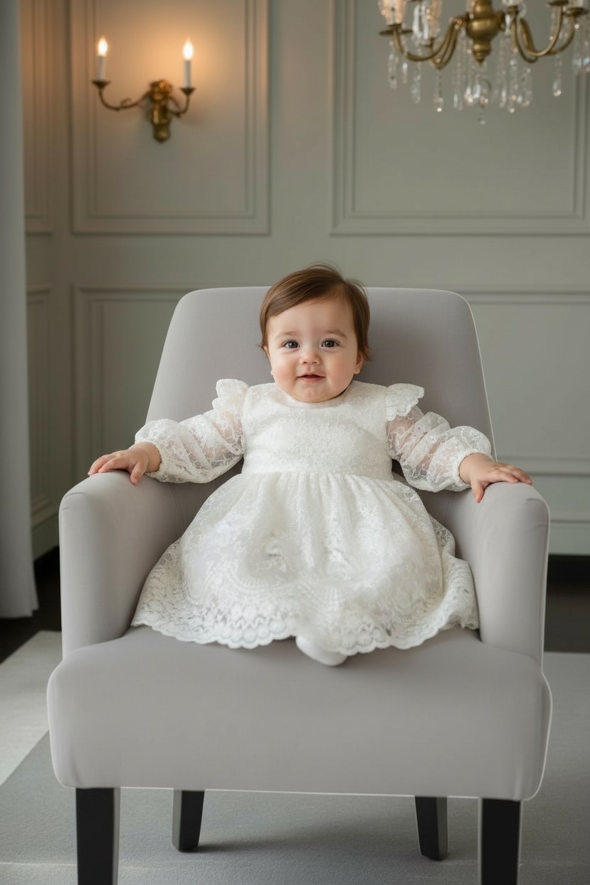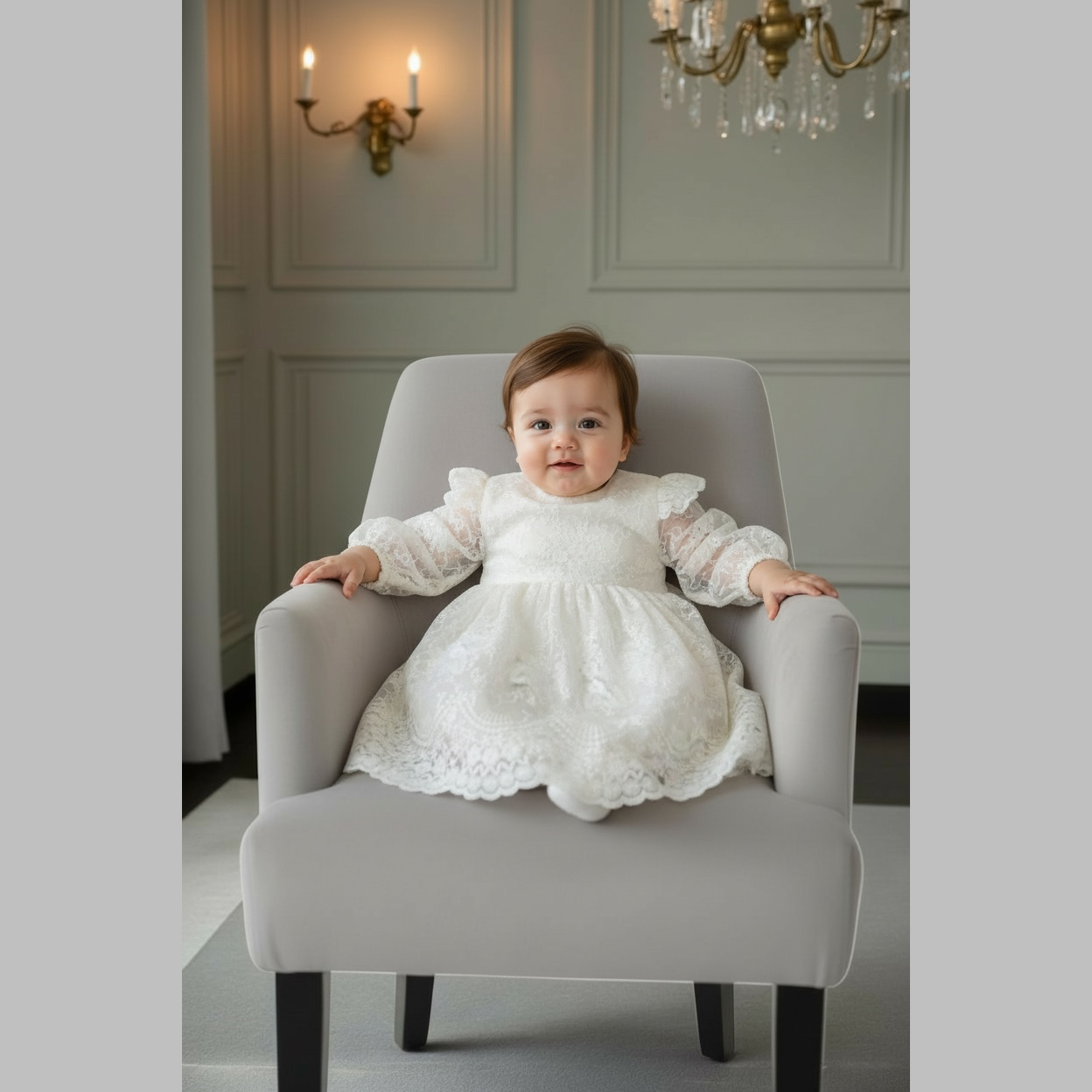 Sukienka wykonana z niezwykle subtelnego, bawełnianego haftu na delikatnym tiulu. Całość podszyta batystową podszewką dla komfortu dziecka. Kryty, długi suwak sprawi że założenie sukienki nawet najmniejszej pociesze będzie bezproblemowe. Wstążka dopasuje sukienkę pod każde dziecko. Spódnica uszyta z całego koła – będzie przepięknie prezentować się na zdjęciach. Każdy element wykonany jest z szlachetnego odcienia ecru dla zachowania spójności. Wszystkie odcienie ecru dostępnych u nas sukienek, bolerek oraz akcesoriów są przez nas starannie dobierane dla zachowania spójności stylizacji Waszych pociech w tak wyjątkowym dniu.