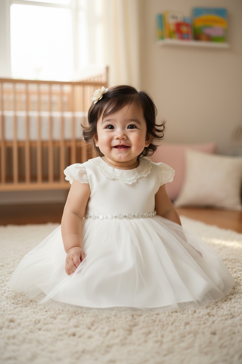 Sukieneczka w kolorze ecru. Niezwykle delikatna i wyjątkowa. Tiulowa spódnica z całego koła pięknie układa się na dziecku. W pasie dekoracyjne kryształki, które podkreślą wyjątkowość stylizacji. Z tyłu kokardka, która będzie nie tylko detalem, ale pomoże wyregulować szerokość sukienki do wymiarów dziecka.