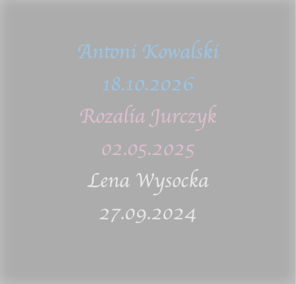 Treść haftu wpisujemy w wiadomości do sprzedającego po wybraniu opcji kolorystycznej haftu.