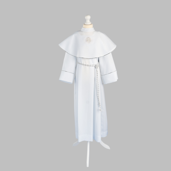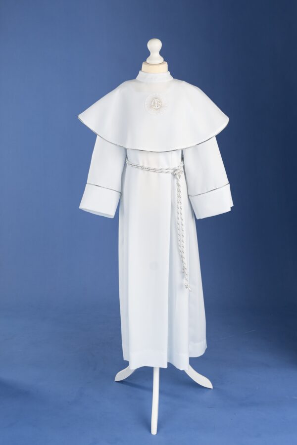 Ponadczasowa klasyka – alba długa. Proste, ale zarazem szlachetne kroje idealne na tak ważną okoliczność. Pelerynka zapinana na suwak. Plisy z przodu wysmuklają sylwetkę, a sznur oprócz funkcji ozdobnej podkreśla talię. Zdobienia dostępne w wersji kolorystycznej: złoto i srebro.