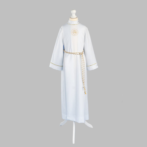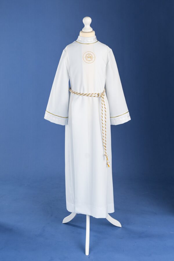 Ponadczasowe alby to idealny wybór dla wielbicieli klasyki. Alby odcinane w pasie szerokim paseczkiem podkreślają talię. Rozkloszowany dół alby jest niezwykle dziewczęcy i pięknie układa się w ruchu. Nakładana na wierzch pelerynka ozdobiona jest białymi kwiatuszkami oraz emblematem i obszyciem dostępnym w dwóch wersjach kolorystycznych: złoto i srebro.