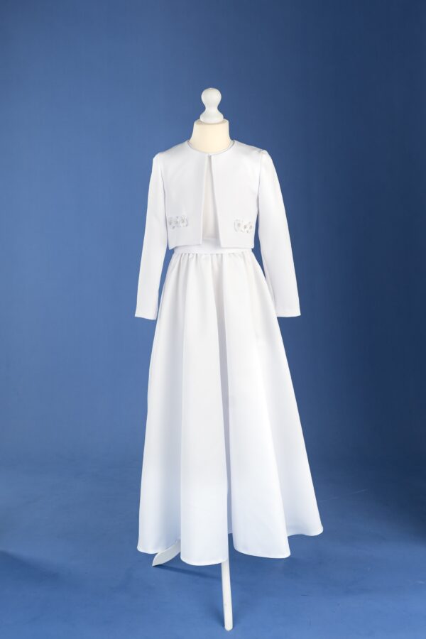 Śliczne bolerko z białego atłasu. Bolerko proste, z delikatną kwiecistą ozdobą na klapie imitującej kieszonkę.