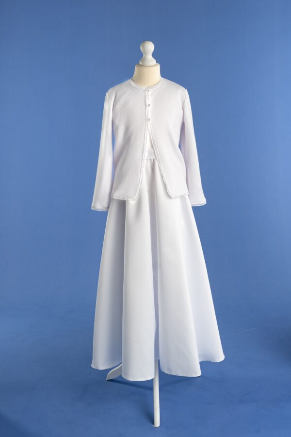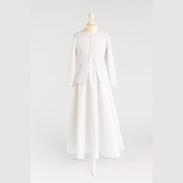 Śliczny sweterek z białej dzianiny. Krawędź sweterka obszyta falbanką. sweterek zapinany na guziczki.