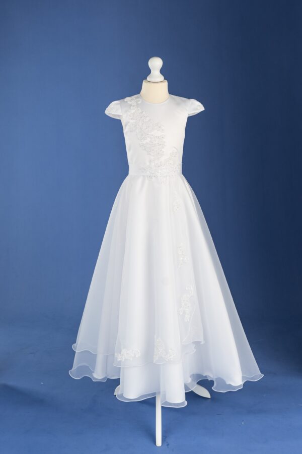 Całość zwieńczona z tyłu kokardką, która pełni też formę regulacji i pomaga dopasować sukienkę do figury dziecka.