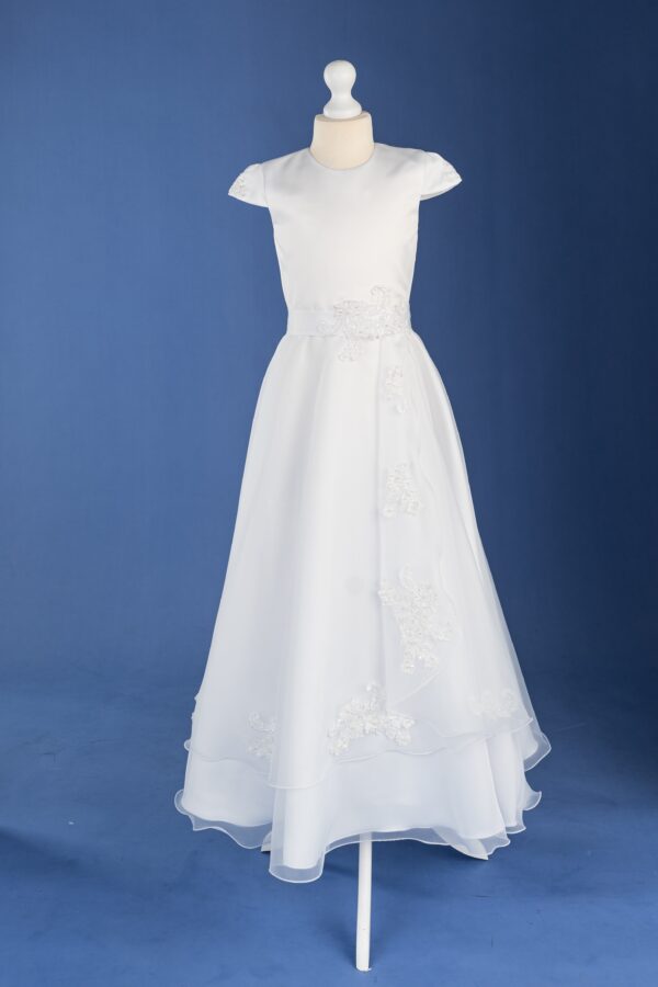 Całość zwieńczona z tyłu kokardką, która pełni też formę regulacji i pomaga dopasować sukienkę do figury dziecka.