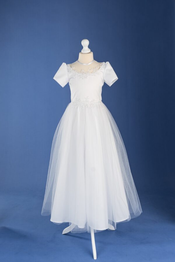 Diana z tiulem to sukienka komunijna dla dziewczynek, które lubią przykuwać wzrok. Góra sukienki posiada przezroczysty mały dekolt, który otoczony jest kwiatuszkami wyszywanymi perełkami – te same dekoracje znajdziemy wpisie sukienki dla zachowania spójności i podkreślenia jej wyjątkowości. Lekko dłuższy rękawek lekko uniesiony na ramieniu jest bardzo elegancki i wygodny dla dziecka. Spódnica uszyta jest z całego koła przez co pięknie się układa, a tiulowa warstwa podkreśla cały charakter stylizacji.