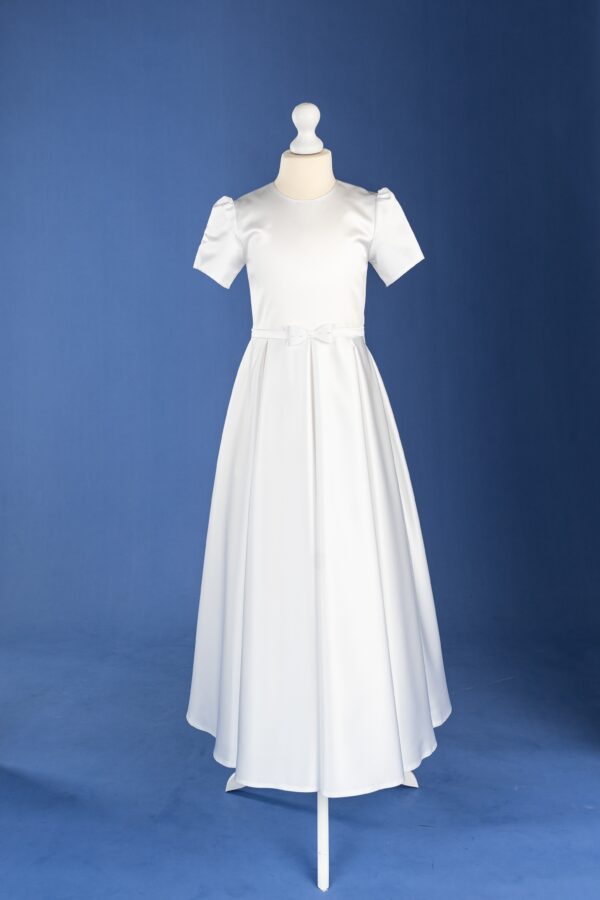Plisa – to klasyka wśród sukienek ślubnych. Gładka góra sukienki pięknie koresponduje z dłuższymi rękawkami lekko uniesionymi przez bufkę, która jest niezwykle elegancka. W pasie cienki paseczek z kokardką dla podkreślenia tali. Spódnica uszyta z całego koła posiada plisy – przez co sukienka nabiera odświętnego charakteru.