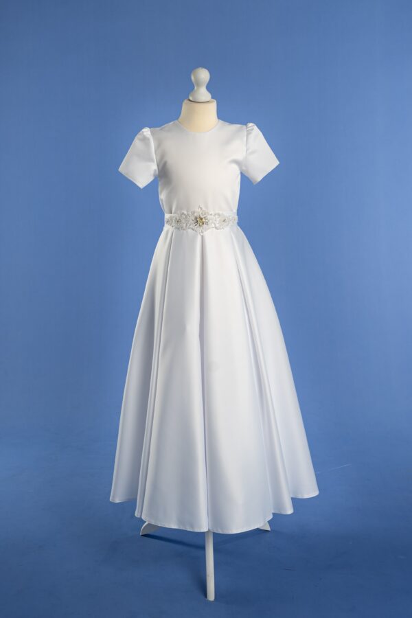 Tosia to delikatna sukienka komunijna. Gładka góra i delikatny, dłuższy rękawek wraz z spódnicą szytą z całego koła tworzą klasyczną bazę, która zwieńczona jest szerokim paseczkiem na którym znajduje się przepiękna aplikacja wyszywana perełkami i kryształkami będąca główną ozdobą sukienki. Całość wyglada bardzo elegancko, ale zarazem dziewczęco.