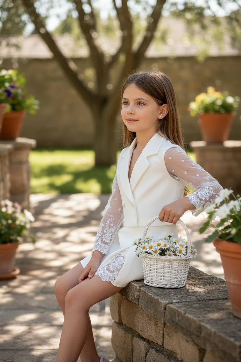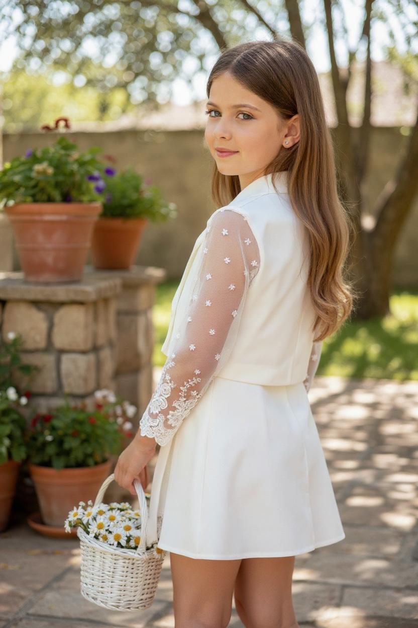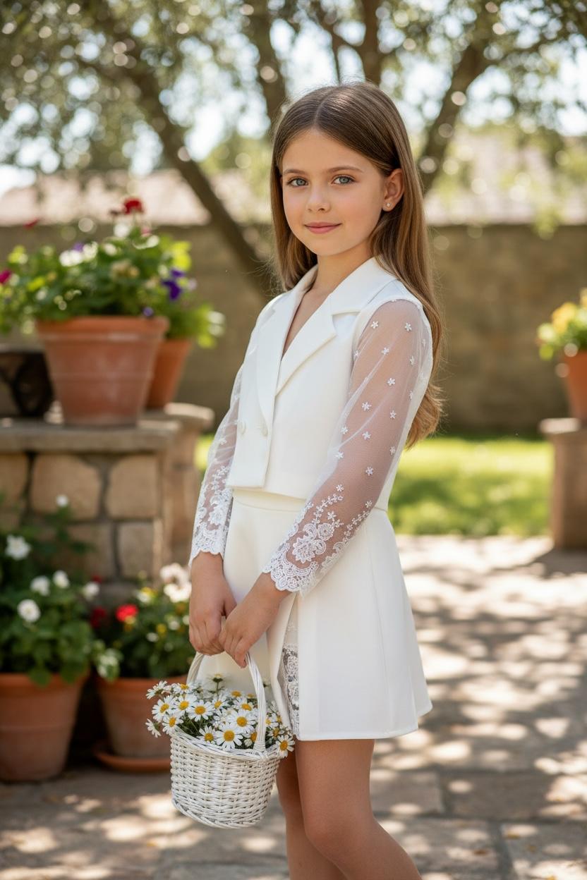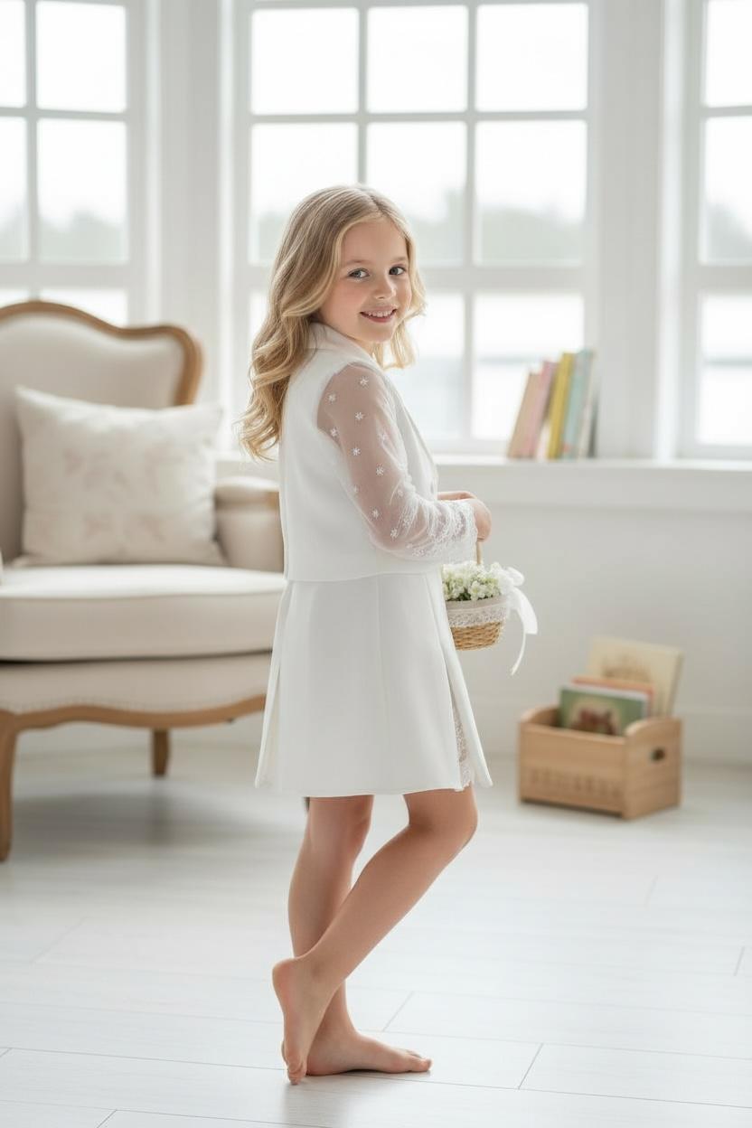 Ecru komplet ze koronkowymi dodatkami to idealna propozycja dla dziewczynek ceniących sobie wygodę. Spódnico-spodenki w nowoczesnym kroju, ozdobione koroneczką przy rozcięciu. Żakiet ozdobiony koronkowymi rękawami i ecru guziczkami. Całość wykonana z mięciutkich materiałów idących w parze z elegancją.