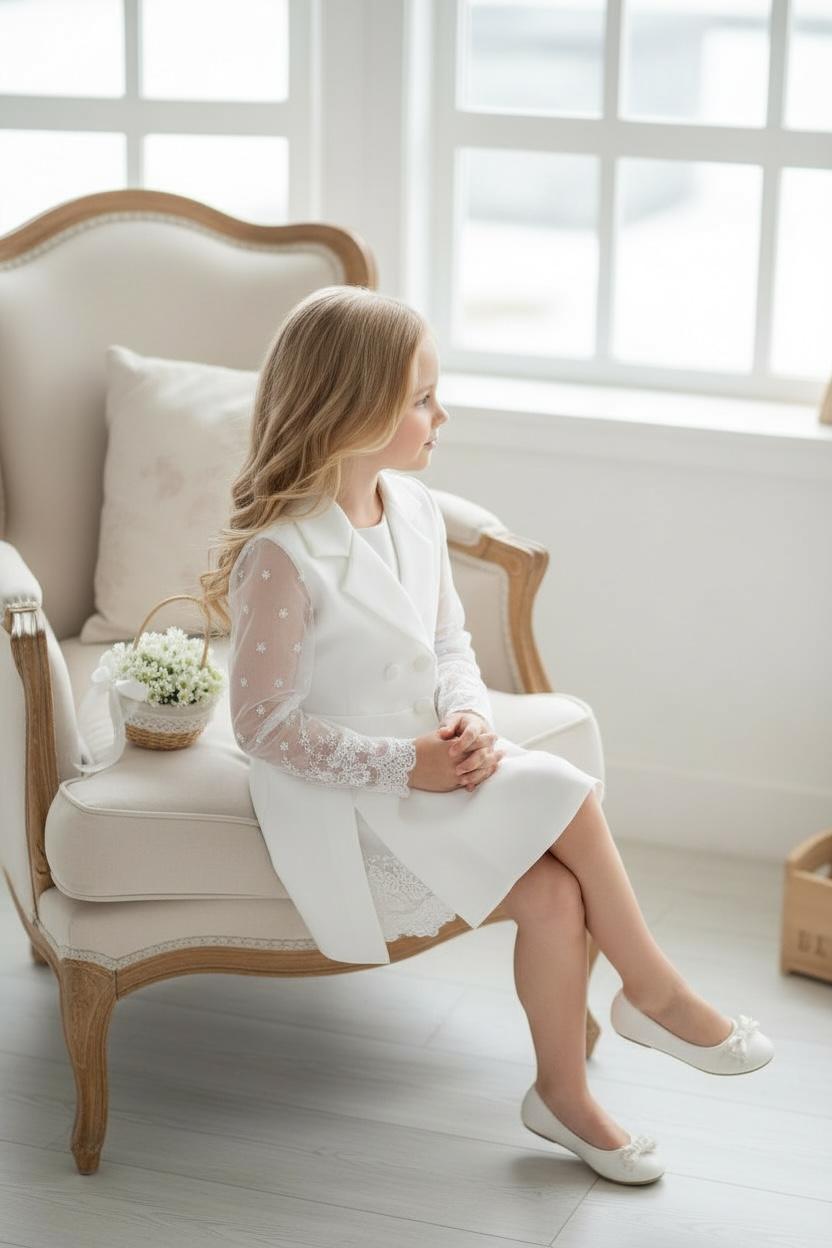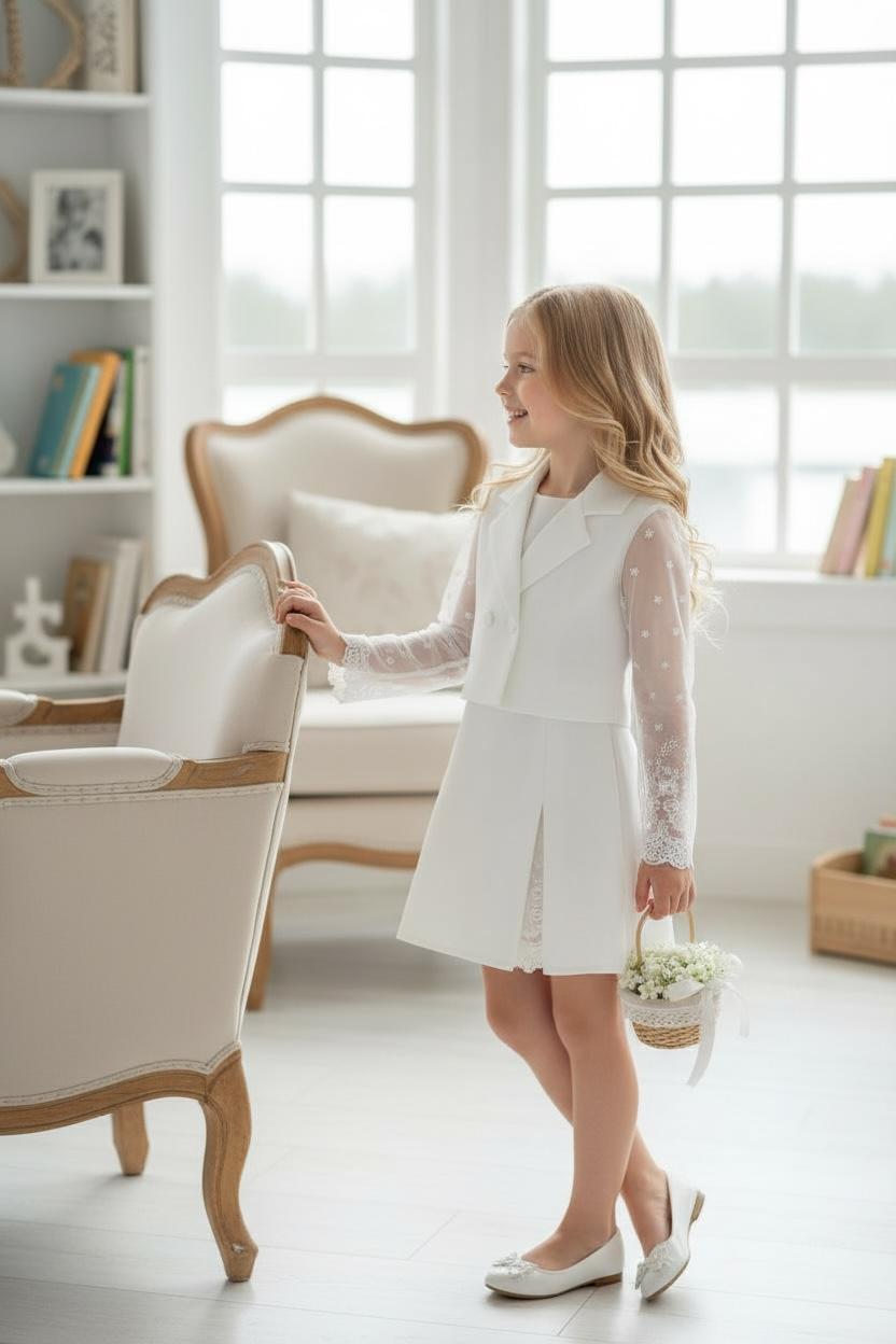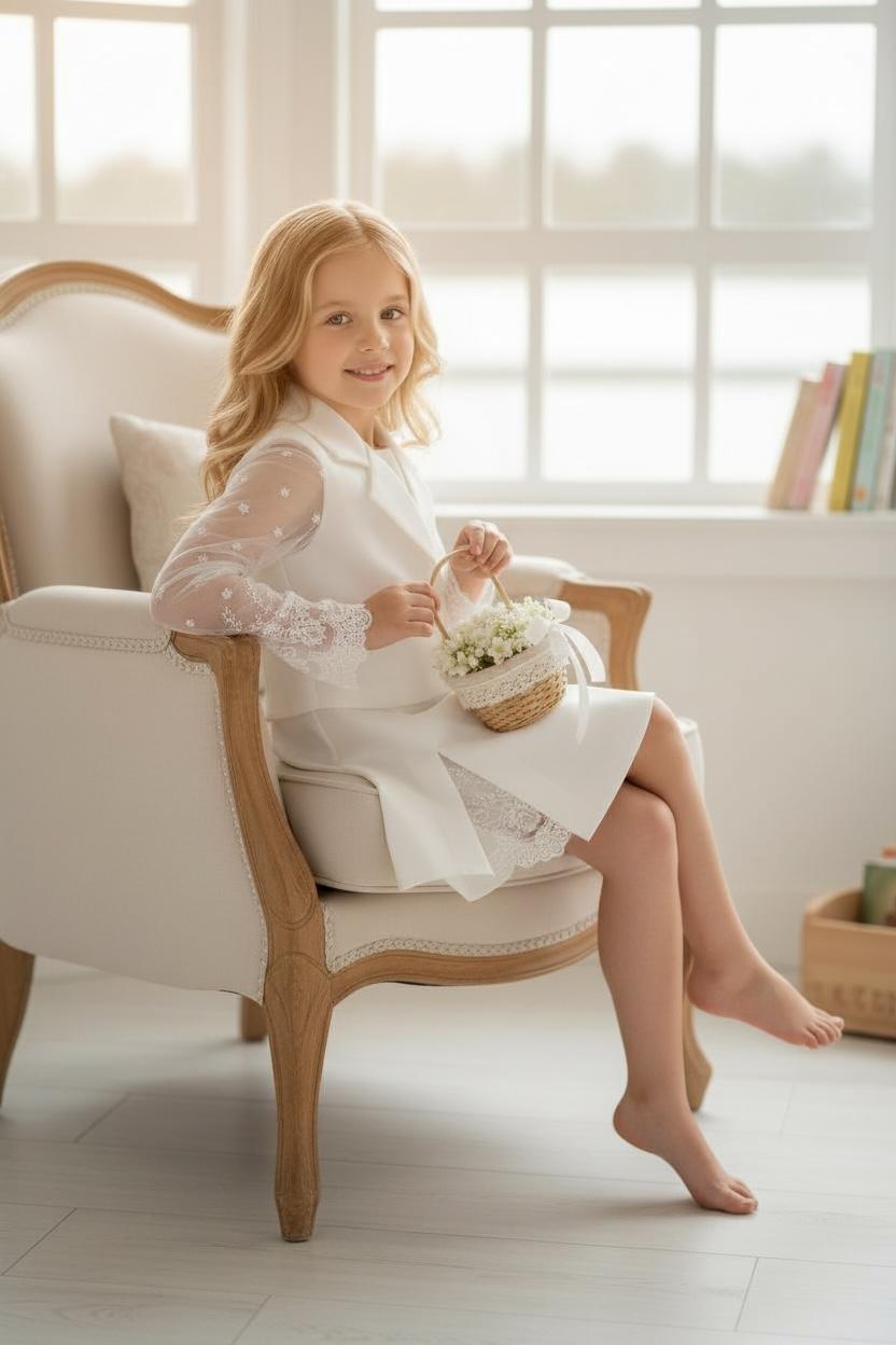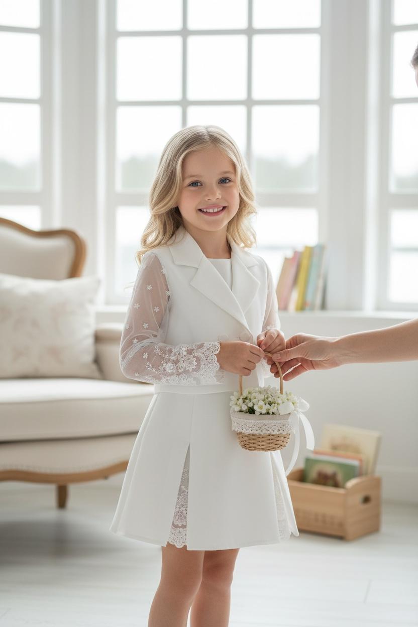 Ecru komplet ze koronkowymi dodatkami to idealna propozycja dla dziewczynek ceniących sobie wygodę. Spódnico-spodenki w nowoczesnym kroju, ozdobione koroneczką przy rozcięciu. Żakiet ozdobiony koronkowymi rękawami i ecru guziczkami. Całość wykonana z mięciutkich materiałów idących w parze z elegancją.