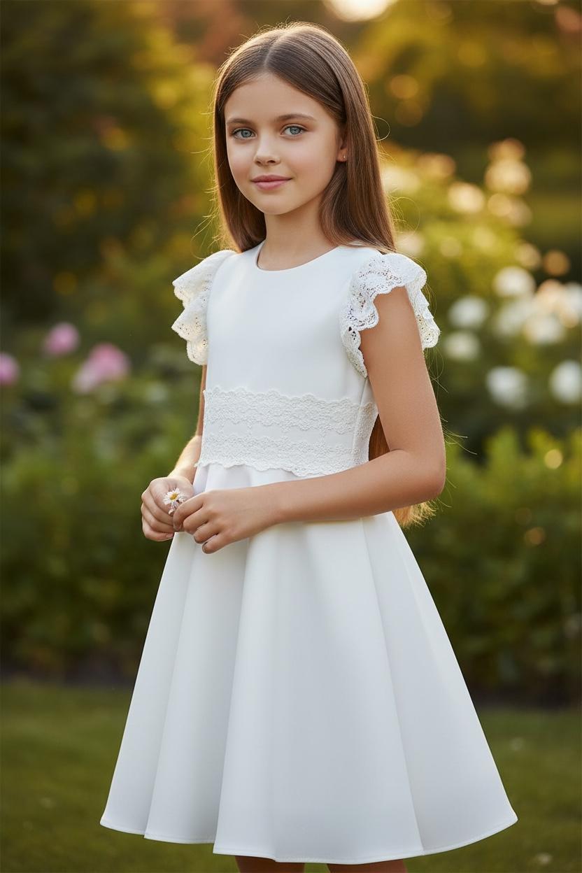 Sukienka delikatna i prosta, ozdobiona niezwykle subtelnym, bawełnianym haftem wv talii. Całość podszyta batystową podszewką dla komfortu dziecka. Krótki rękawek pozostaje przeźroczysty dla zachowania unikalnego charakteru sukienki. Spódnica gładka i prosta, nadająca objętości i lekkości. Spódnica uszyta z całego koła – będzie przepięknie prezentować się na zdjęciach. Sukienka zapinana na kryty suwaczek, dodatkowo z tyłu znajduje się kokardka, która pomoże dopasować kreację pod figurę dziecka.